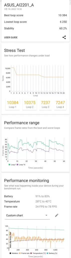 X 모드를 끈 상태에서 3DMark 야생 동물 스트레스 테스트에서 점수는 10384였으며 온도는 28°C에서 40°C(12°C 증가)로 증가했고 24-78FPS가 발생했습니다.