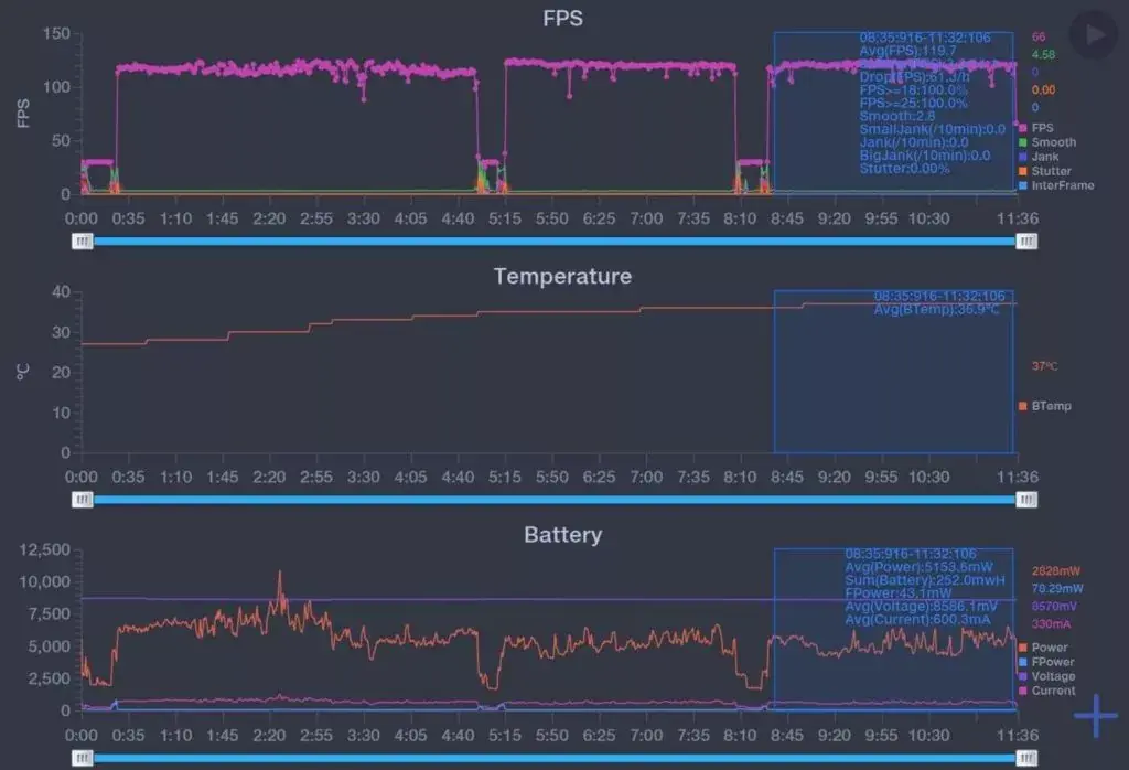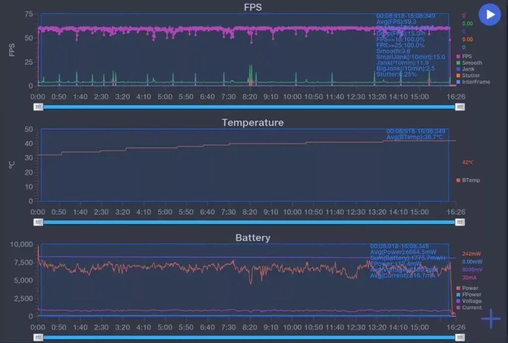 소비전력은 샤오미 12S 울트라의 82.5mW 보다 높지만 , 프레임 레이트는 60FPS에 가까운 수준으로 뛰어나다.
