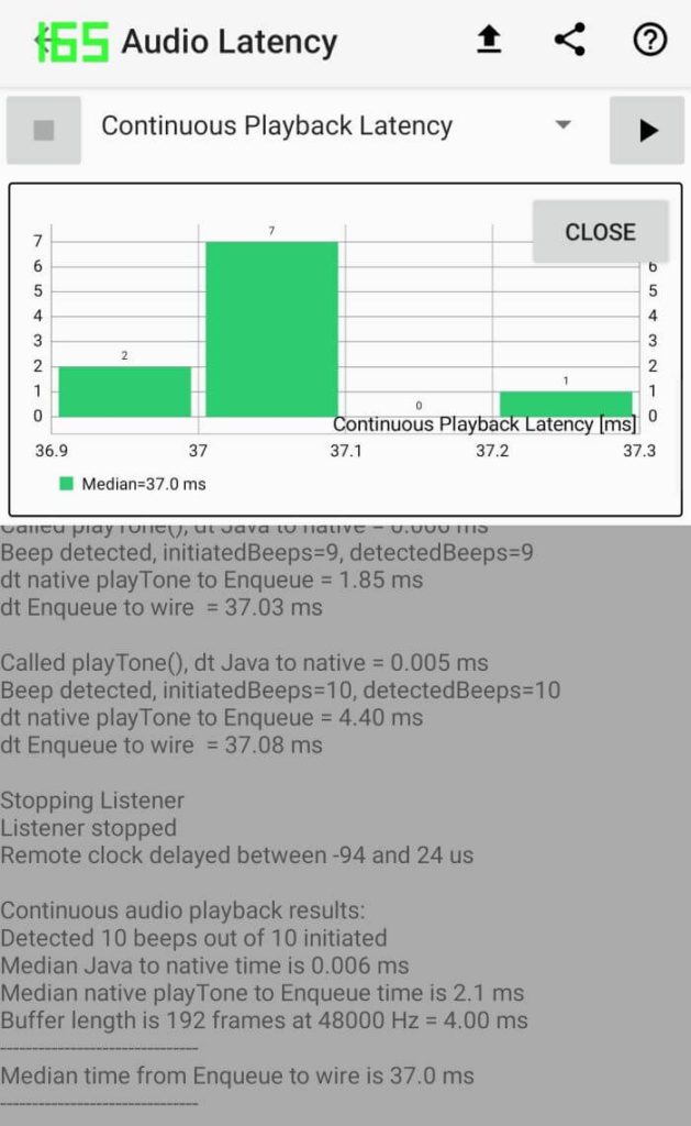 WALT Latency Timer를 사용하여 이어폰 잭의 오디오 출력 지연 시간을 측정한 결과 37ms였습니다.