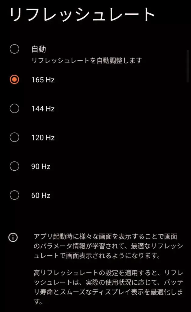 165Hz의 높은 주사율을 지원하며, 선호도와 배터리 소모량에 맞게 60, 90, 120, 144, 165Hz 중에서 선택할 수 있습니다.