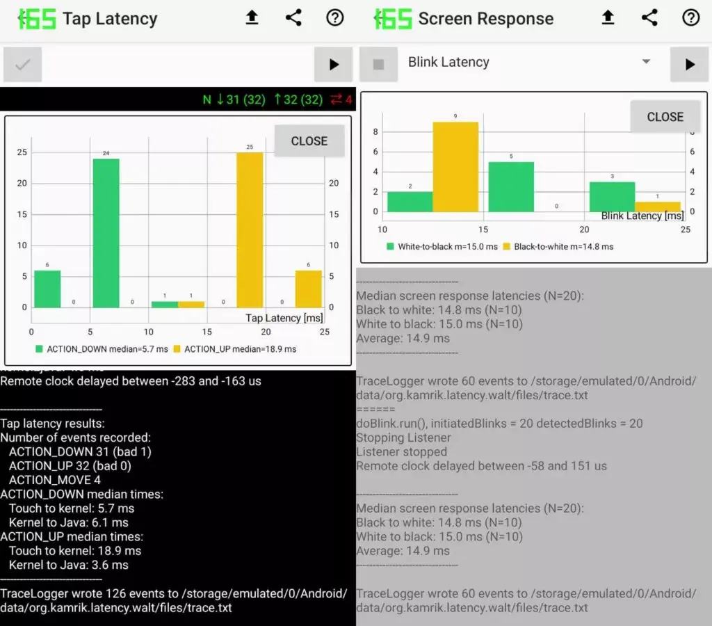 WALT Latency Timer로 측정한 터치 대기 시간은 터치에서 커널까지 5.7ms, 커널에서 Java까지 6.1ms, 화면 렌더링의 경우 14.9ms로 총 26.7ms였습니다.