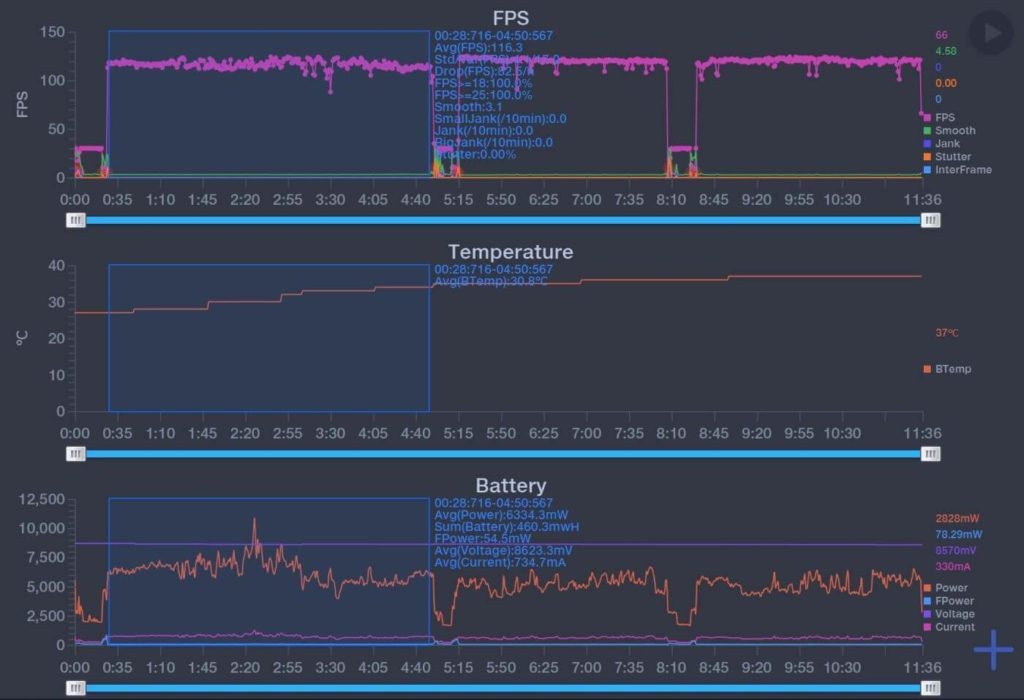 월드 오브 탱크 블리츠(World of Tanks Blitz)에서 120FPS 설정과 모든 그래픽 설정을 최고 값으로 플레이할 때 X 모드를 끈 상태에서 평균 FPS는 116.3FPS였습니다.