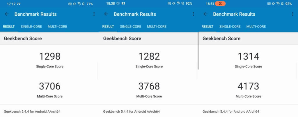 왼쪽에서 오른쪽으로, 점수는 Genshin으로 위장한 Geekbench, 일반 빌드 및 X 모드 활성화입니다.