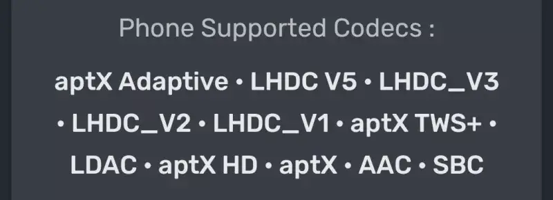 공식 블루투스 코덱은 공식 웹사이트에 AAC / LDAC / LHDC 5.0 호환으로만 나열되어 있지만 실제로는 aptX Adaptive 및 TWS+도 사용할 수 있습니다.