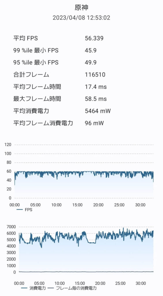 다음으로 성능 모드에서 30분 동안 플레이한 결과 평균 56.339FPS가 발생했으며 FPS당 96mW를 소비했습니다.