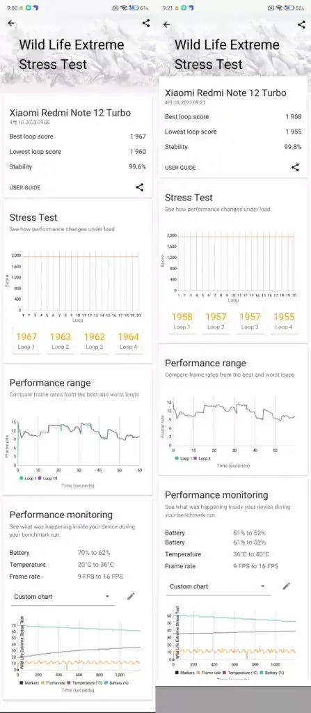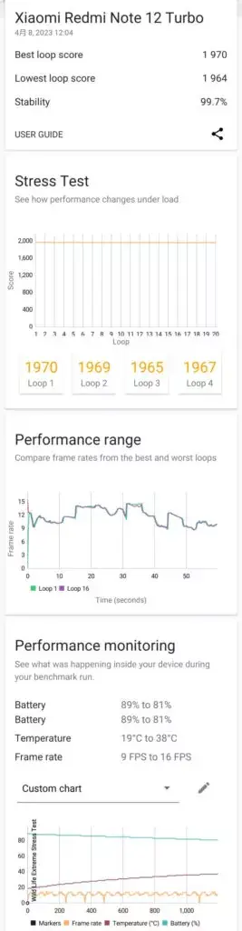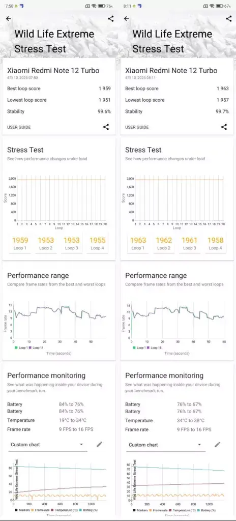 패키지 이름을 위장한 3DMark의 Wild Life Extreme Stress Test는 1970~1964년의 점수를 보여주었으며 온도는 19°C에서 38°C(19°C 증가)로 증가했으며 배터리 소모량은 8%였습니다.