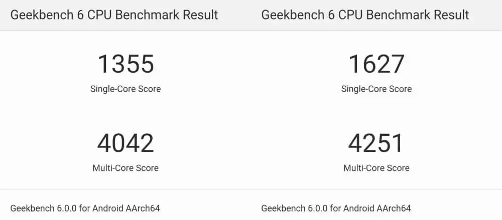 Geekbench 6에서 패키지 이름이 위장된 버전(즉, 제조업체 부스트의 영향을 받지 않음)에는 싱글 코어 1355와 멀티 코어 4042가 있었고 일반 버전에는 싱글 코어 1627과 멀티 코어 4251이 있었습니다.