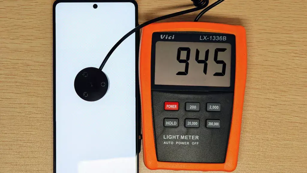 자동 밝기 조정 기능을 켠 상태에서 올화이트 HDR 영상 재생 중 LX-1336B 로 밝기를 측정했더니 최대 945니트에 달했다.