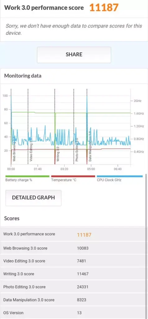 문서 조작 등 일상적인 사용 성능을 측정한 PCMark Work 3.0(패키지 이름 위장)은 11187점을 받았습니다.